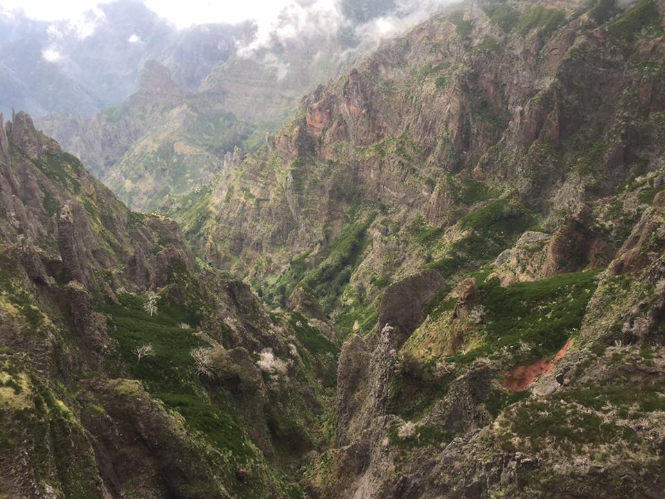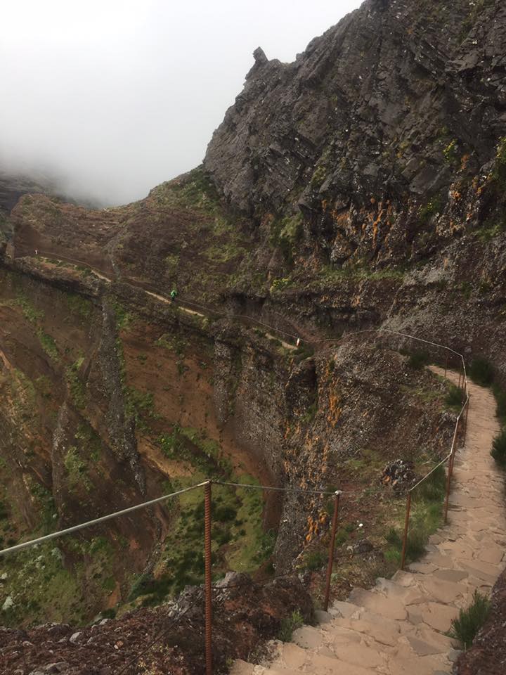 It wasn’t yet 6pm and next stop was Pico do Areeiro which really was the last high peak on the course. My ambition was to get there and down the other side before dark. According to the map it was only 5K away and 300 metres lower so it should be straightforward. Nope, it involved a drop of 800 metres down steps and ladders with sheer drops. A trip through two 100 meter long tunnels through the mountain and then a horrific scramble back up another 600 metres of stairs, , steps, rocks and ladders. The guide ropes provided some reassurance, but there was still lots of this ..