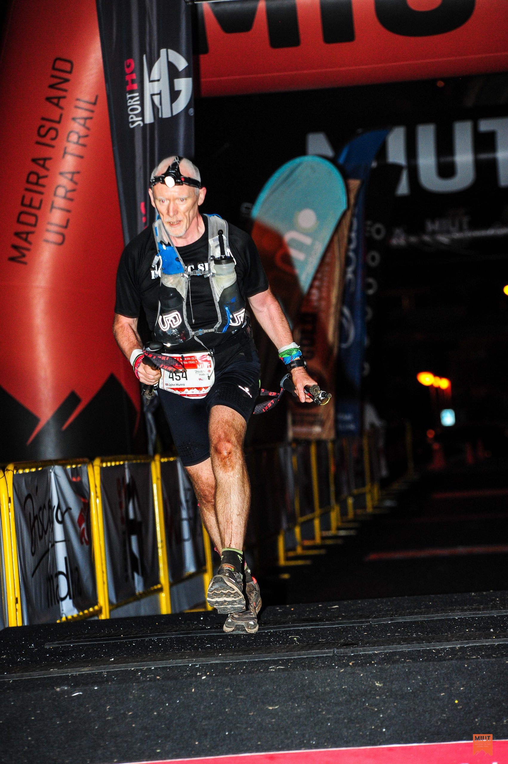 It was slow but finally into the final checkpoint and only 4K to go. There was a hint of light in the sky and some lights from cottages provided some help so I sucked in some air and started running. For the first time in 24 hours I felt like I was running properly. I left my companions behind and picked up even more speed. Along the narrow concrete path at the side of the last Levada, I passed a good number of people and felt stronger and stronger. Cockerels were crowing down in the valley and I could see the bay of Machico getting closer. As always there was a detour, another uphill which I ran much to the amusement of the Marshals, down a steep grassy bank, some steps and bounded out on to the road by the beach. Job done. round the corner, follow the cones over the footbridge and there is the Arch. It is 5:30 am and I am sprinting towards the finish line. Up and over the ramp and inexplicably in a mixture of exuberance and relief I jumped through the finish line.
